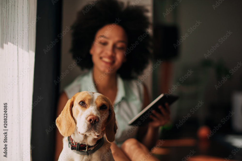 Mixed race woman petting her dog and using tablet while sitting on the floor.