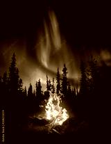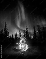 A warm and cosy campfire in the wilderness with forest trees silhouetted in the background and the stars and Northern Lights (Aurora Borealis) lighting up the night sky. Photo composite.