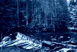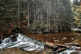 Waterfall in nature pine Scandinavian mountain forest in evening light. Wet cold rock stones covered with northern moss. Nordic spruce tree forest background. Travel concept. Landscape view.