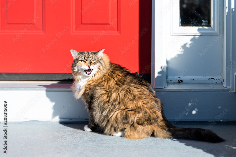 Angry calico maine coon cat with green eyes meowing open mouth standing body outside by red door wanting asking begging to go inside