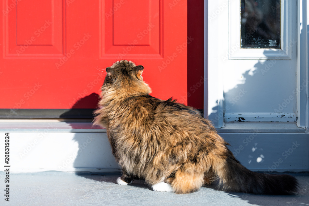 Angry calico maine coon cat standing outside by red door wanting asking begging to go inside