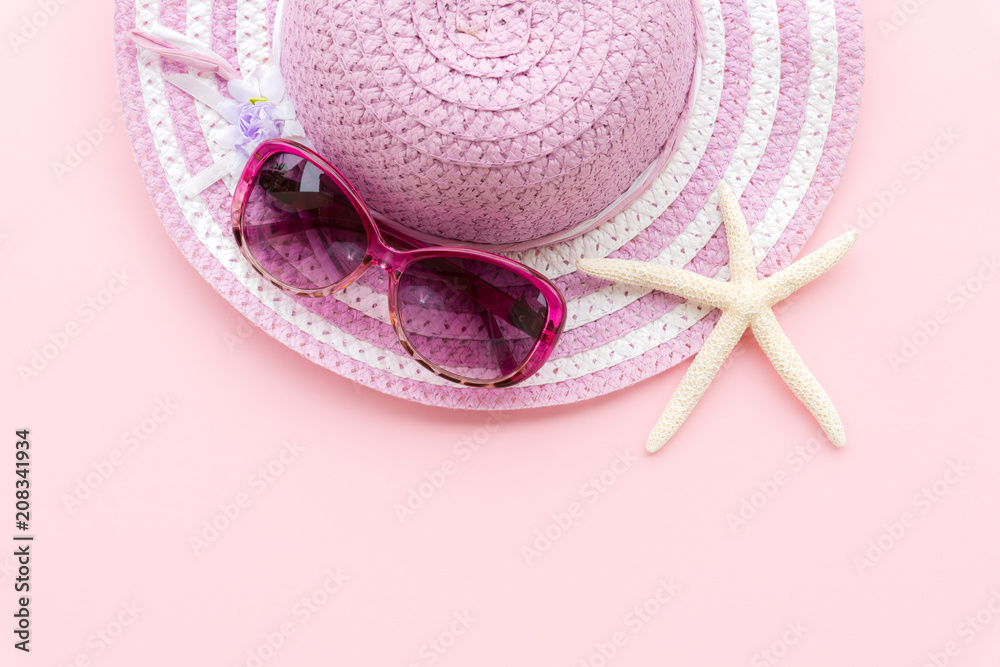 Beach accessories including starfish, pink sunglasses and purple beach hat on cyan paper background for summer holiday and vacation concept.