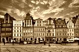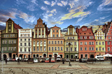 Central market square in Wroclaw Poland with old colourful houses, street lamp and walking tourists people at gorgeous stunning evening sunset sunshine. Travel vacation concept