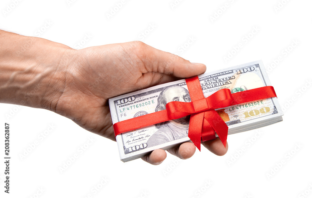 Concept, money as gift, win or bonus. Man's hand takes or gives pile of 100 dollar bills tied with red ribbon with bow. Isolated on white background.