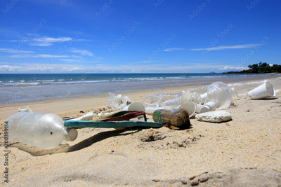 Plastic pollution on beach. Plastic bottles, bags and other garbage washes up in beach