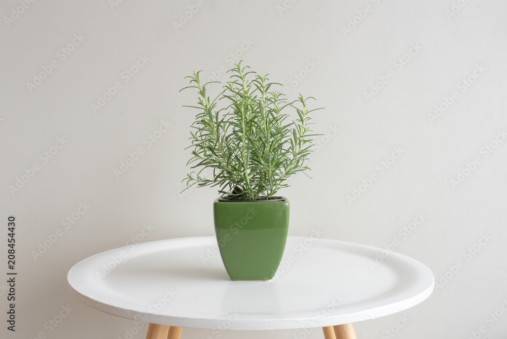 Rosemary plant in green ceramic container on small white round table against neutral wall background