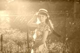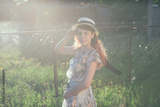 Girl in hat and long hair at sunset - sunlight and back view concept