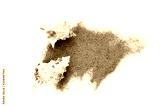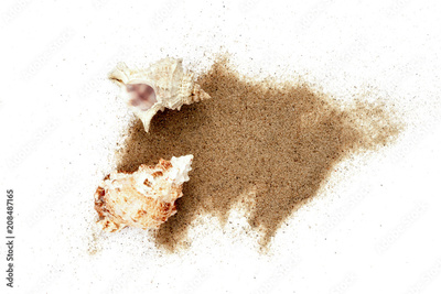sea shells in sand pile isolated on white background, top view. Vacation concept.