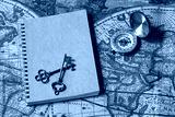 Compass, antique keys and notebook on blur vintage world map, journey concept, copy space