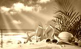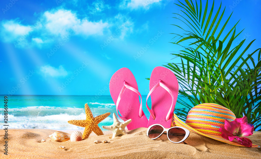 Straw hat and sunglasses on beach