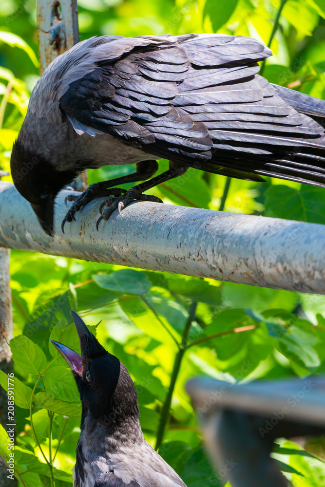 Grey crow in city park. Advanced species of commensal animals