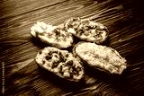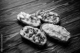 Baked potatoes in foil with various fillings.