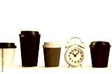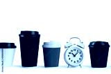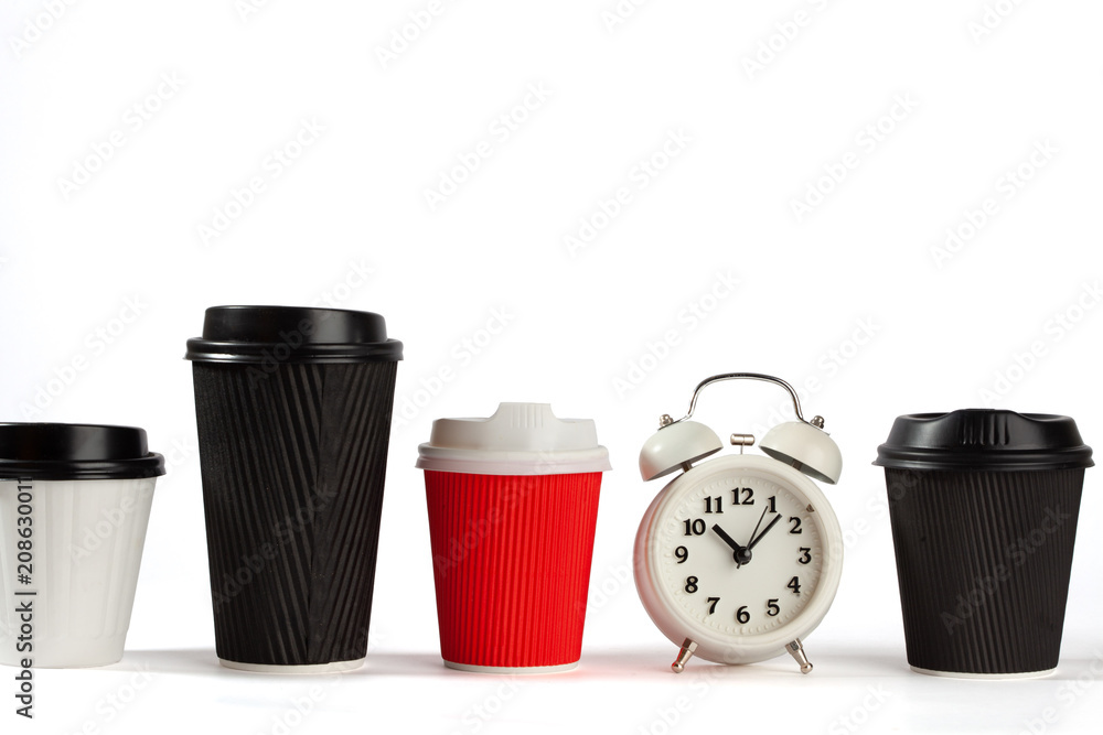 Coffee break concept depicted with vintage alarm clock and plastic coffee cups in a row on white background with copy space