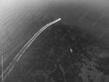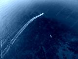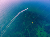 Aerial view of small sailing fishing boat leaving white water trail on shallow ocean water