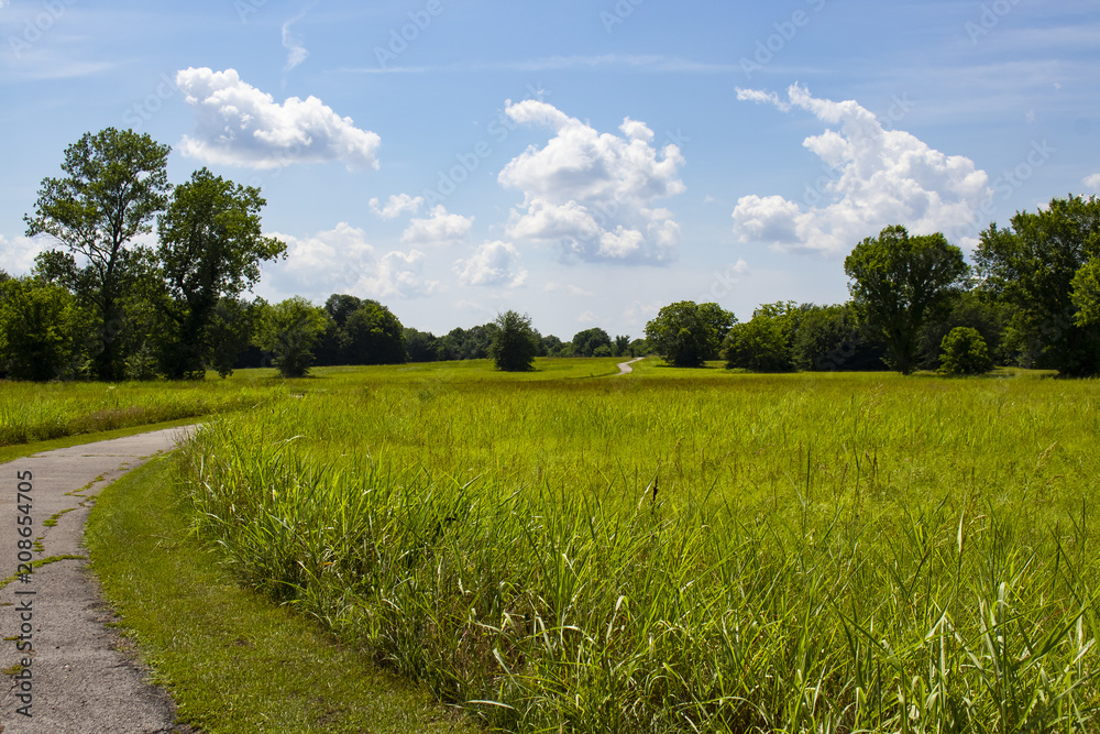 Winding path curves through meadow of grass and by green trees and up over hill all under beautiful blue sky and fluffy clouds