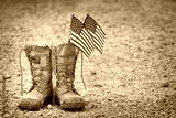 Old military combat boots with dog tags and two small American flags. Rocky gravel background with copy space. Memorial Day or Veterans day concept.