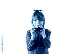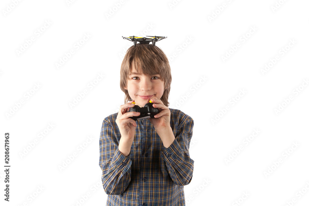 Happy boy with a small drone on top of his head and holding the remote control. Isolated on white background.
