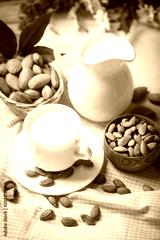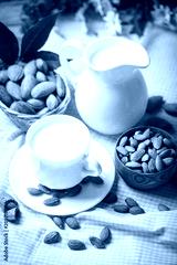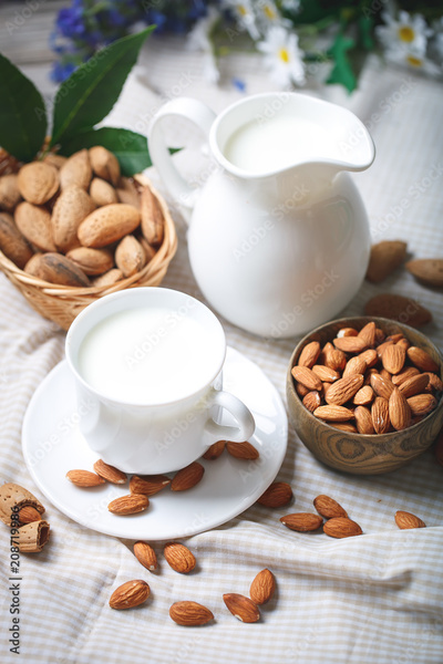 Almond and almond milk on a wooden table in the summer garden. Useful food.