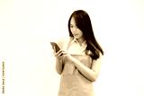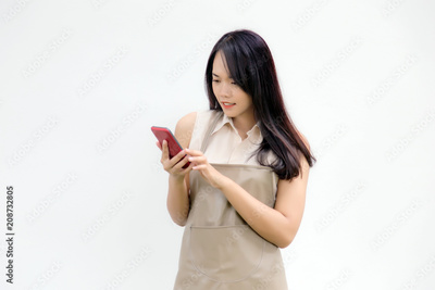 asian lady with apron dress look at mobile screen f