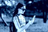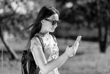 The brunette girl in sunglasses. In the summer in open air. Behind the backpack. In his hands holds a smartphone. Corresponds with friends. The teenager after school is on break.