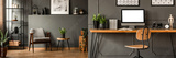 Dark open space living room interior with metal rack, grey armchair and plants in the background and study corner hairpin desk, books and empty monitor in the foreground