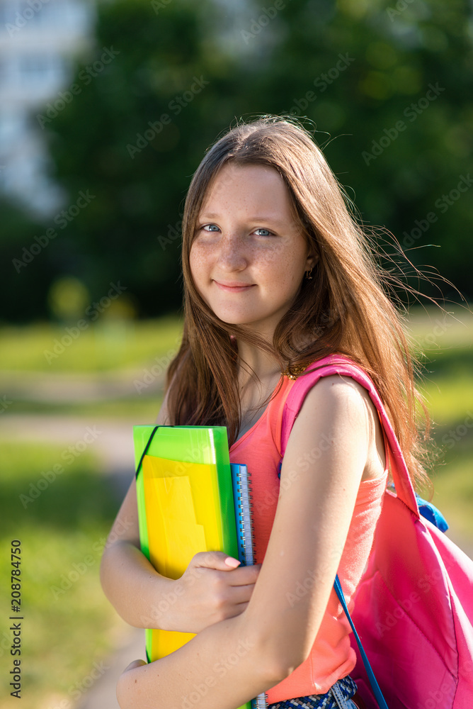 Beautiful brunette girl. Summer in nature. He rest after school. In the hands of a notebook are textbooks. On the back is backpack. Happy smiling. Enjoys the rest.