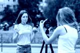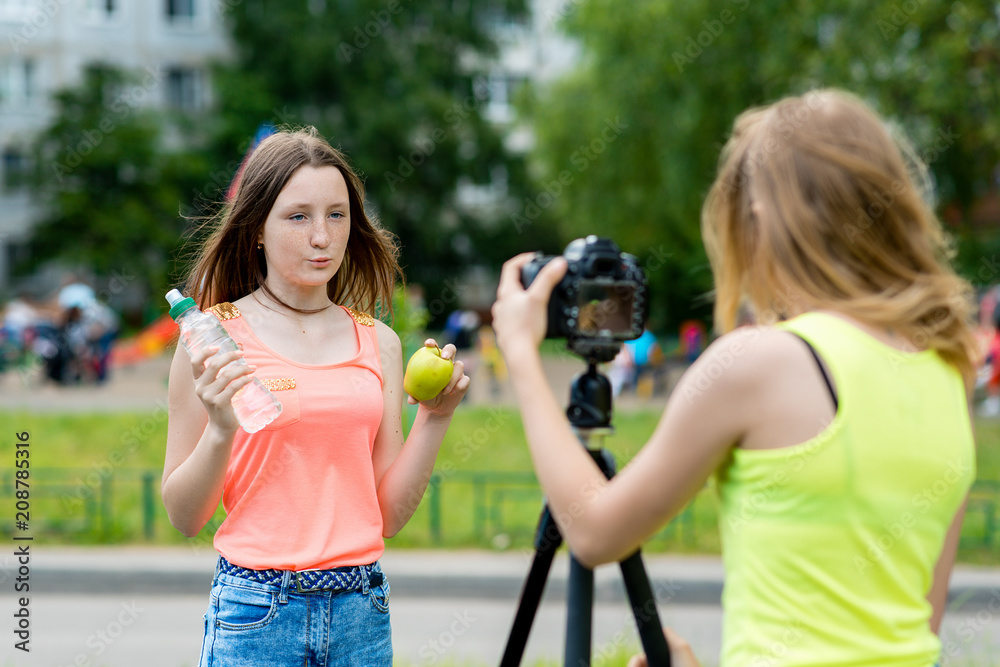 2 girls talk about fruits. Healthy brother lives a proper diet. In her hands holds bottle water and apple. Record vlog and blog subscribers. Record video lesson Internet. Use camera with tripod.