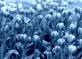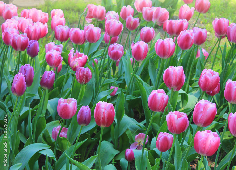 Bright Purple Fresh Tulips Blooms on Beautiful Flower Bed at Local City Park. Nature Scene with Fresh Tulipa Flowers Growing Outdoors on Warm Sunny Spring Day with Sunlight Early Morning Glow.
