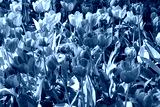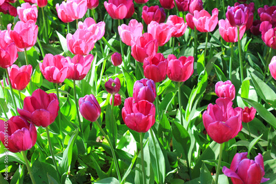 Tulip Flowers with Warm Sunlight Glow Outdoors. Beautiful Vibrant Pink and Purple Colorful Bright Tulips on Flowerbed Field. Nature Background of Spring Fresh Bright Tulip Flowers Field at Park Glade.