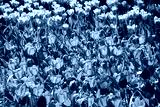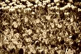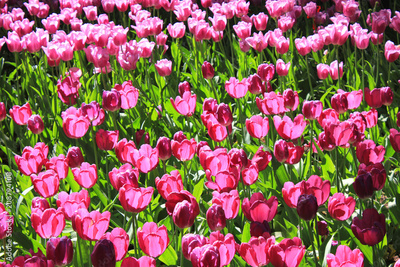 Tulip Flowers Blooms on Garden Bed, Spring Season Scene. Colorful Soft Pink, Red, Purple Tulip at Garden Flower Bed Field Close Up. Nature Image with Fresh Tulip Bulbs ad Natural Sunlight Warm Effect.