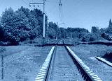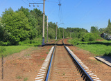 Train Rail Road Track Parallel Sleepers Perspective View with Green Forest and Trees on Summer Landscape. Industrial Background with Empty Railway on Sunny Summer Day. Clear Train Railroad Wallpaper.