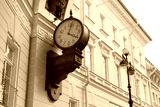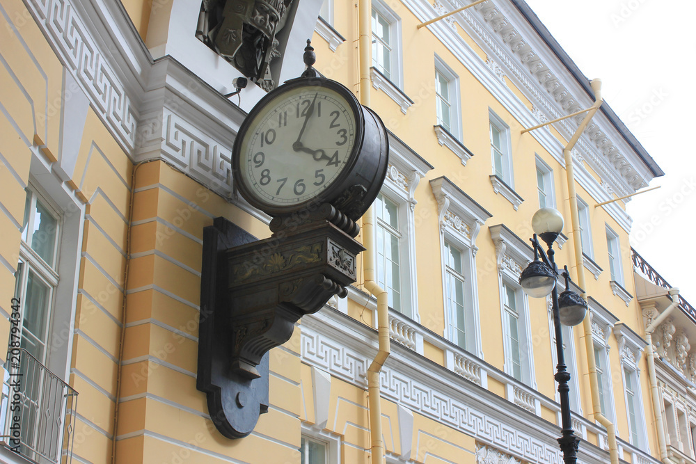 Old Vintage Clock on Triumphal Arch of General Staff Building at Palace Square in Saint Petersburg, Russia. Monumental Neoclassical Style Building Architecture Details of St. Petersburg City.
