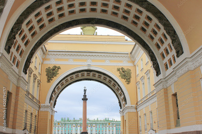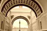 View to Palace Square from Triumphal Arch of General Staff Building in Saint Petersburg, Russia. Historic City Landmarks, Old Building Architecture of St. Petersburg City Center Close Up Wallpaper.