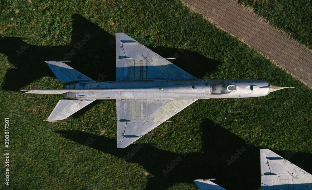 Aerial drone view on old jet fighters.