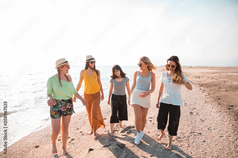 Group of women friends having fun and dancing on the beach. Holiday concept