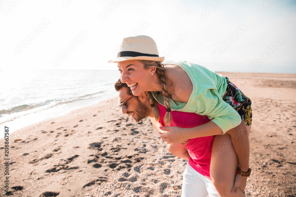 Handsome and happy man carrying his smiling girlfriend on back in paradisiac beach. Holiday and Couple in love concept