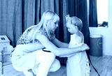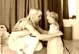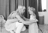 Mother puts on an apron to the little daughter. Mom and daughter prepare for cleaning of the apartment.