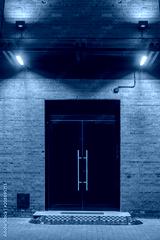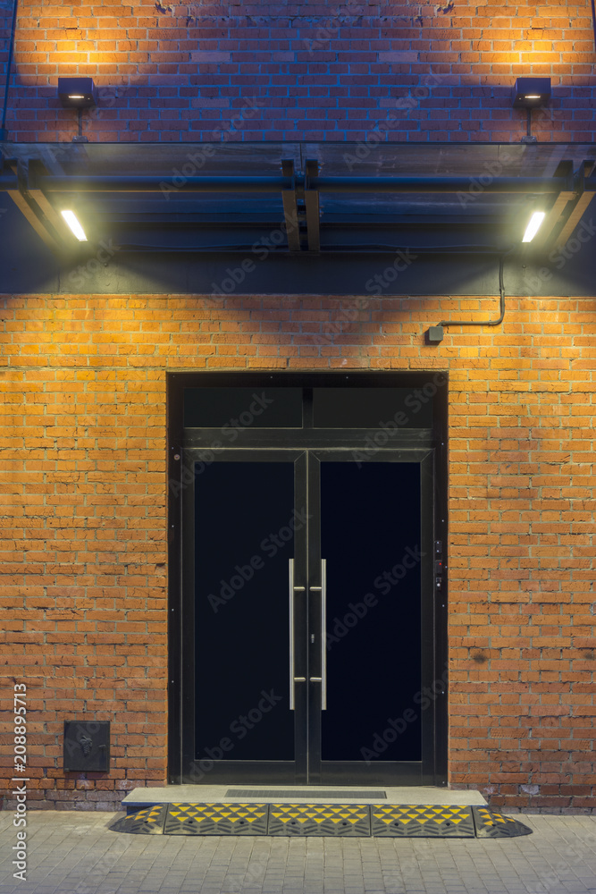 Night view. Industrial building. Large doors in a red brick building. The entrance to the office. Facade