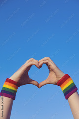 Gay pride concept. Hand making a heart sign with gay pride LGBT rainbow flag wristband