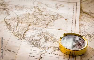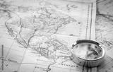 Explorer gold compass placed on a stack of very old geographical maps of North America and the United States.