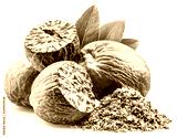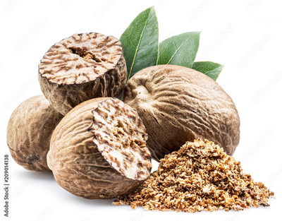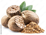 Dried seeds of fragrant nutmeg and grated nutmeg isolated on white background.