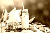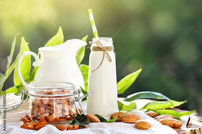 Almond and almond milk on a wooden table in the summer garden. Useful food.