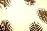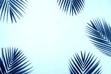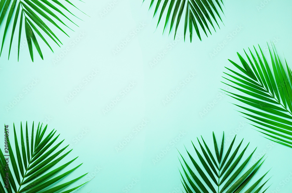 Tropical palm leaves on pastel blue background. Minimal summer concept. Creative flat lay with copy space. Top view green leaf on punchy pastel paper