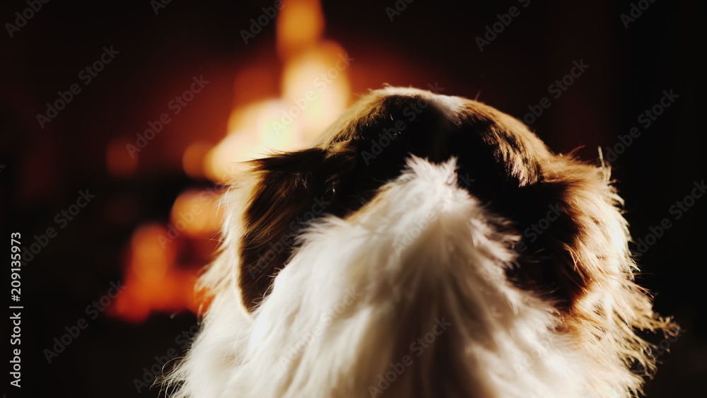 Back view: man strokes his dog, which looks at the fire in the fireplace. Warmth and comfort in the house concept