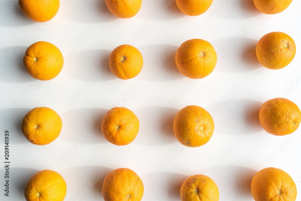 Directly above view of homegrown organic oranges arranged in a pattern on white table with shadows