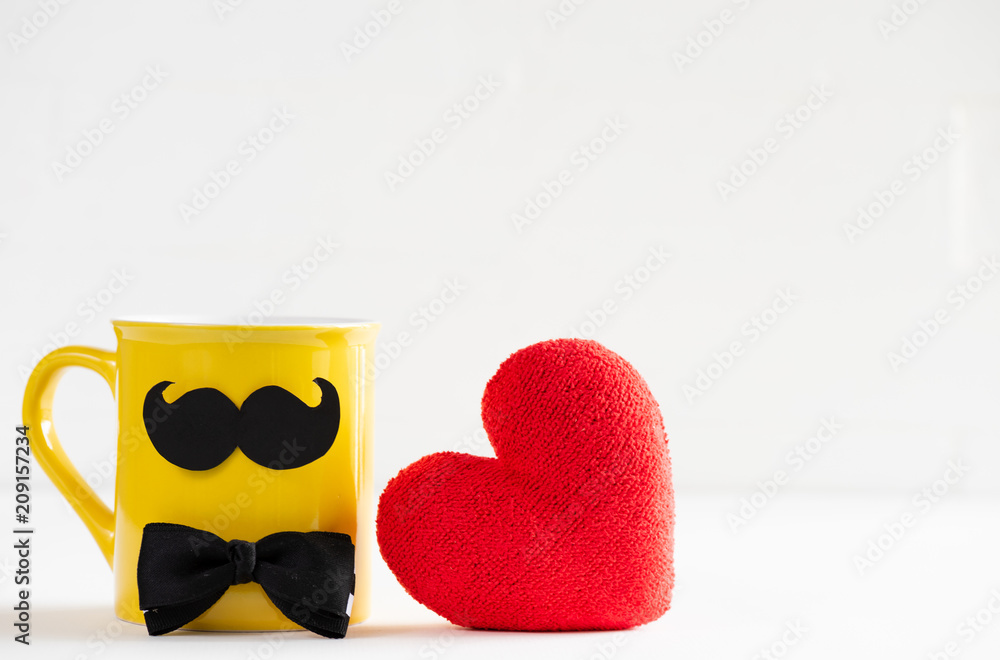 Happy fathers day concept. Handmane red heart with mustache and bow tie on yellow pastel coffee cup on bright white wooden table background.