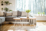 Hairpin tables with fresh tulips in vase standing in bright living room interior with big window, potted plants and grey corner lounge