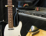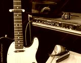A musician’s gear on stage for performance includes black electric guitar, amplifier, blues harmonicas and microphone and pork pie hat.