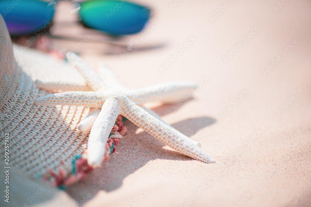 Soft focus on starfish. Beach accessories including sunglasses, starfish, flower and hat beach on Sandy beach background background for summer holiday and vacation concept.