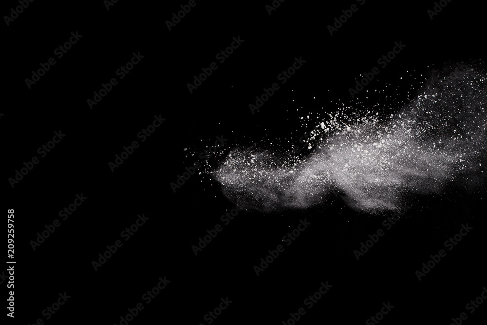 Freeze motion of white dust explosion on black background. Stopping the movement of white powder on dark background. Explosive powder white on black background.